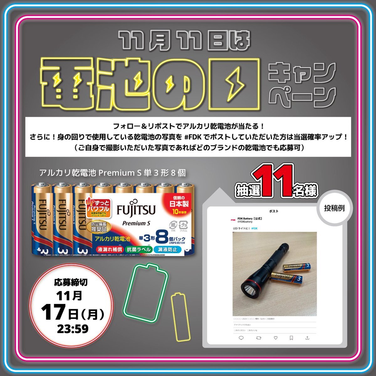 11月11日は #電池の日 キャンペーン🔋 フォロー&リポストでアルカリ乾電池単3形8個が11名様に当たる🎶 さらに‼️身の回りで使用している乾電池の写真を #FDK で投稿していただいた方は当選率2倍🎯 【応募方法】 ①このアカウントをフォロー ②この投稿をリポスト 11/17(月)23:59まで #キャンペーン