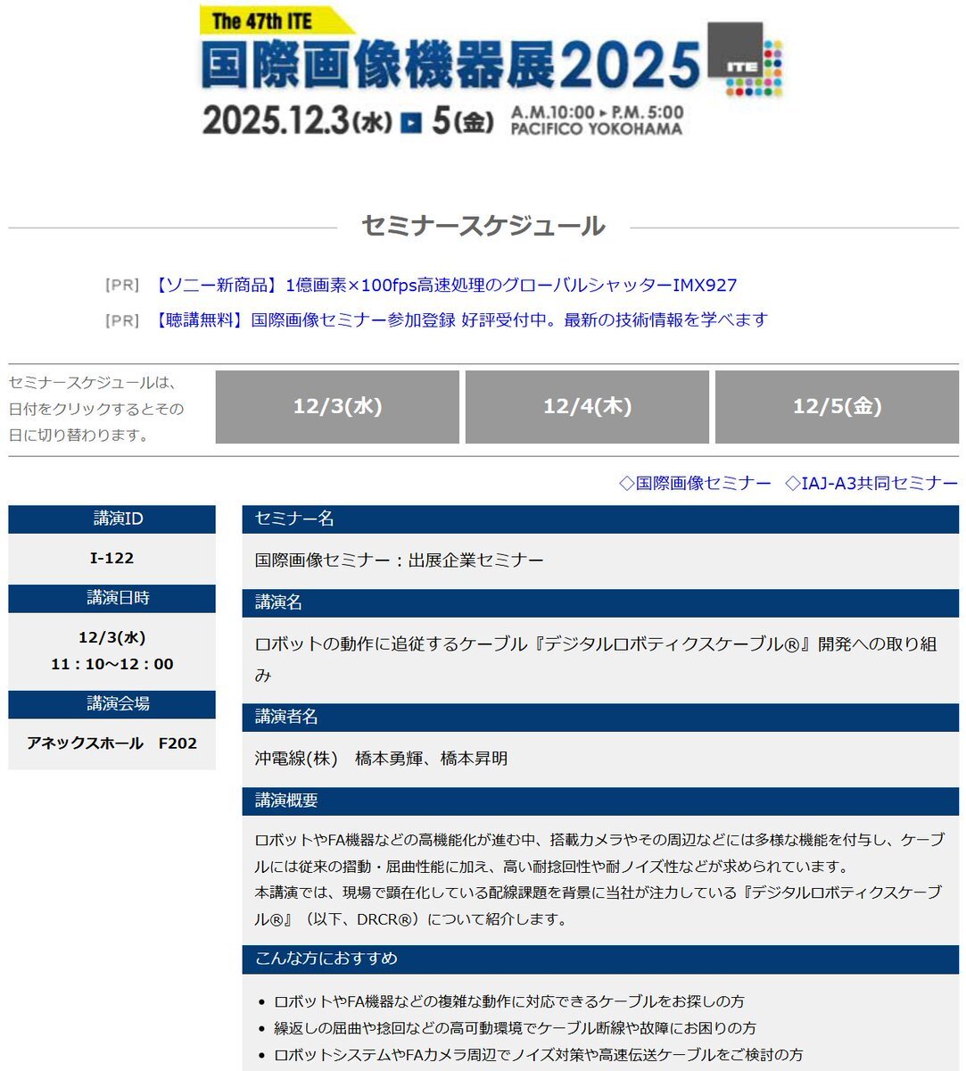 昨日でしたが #電線の日 で 国際画像セミナーのご紹介 12/3の11:10~12:00 「ロボットの動作に追従するケーブル『デジタルロボティクスケーブル®』開発への取り組み」 沖電線(株)の橋本勇輝様・橋本昇明様のご講演 どちらかというとケーブルですが💡 #国際画像機器展 2025 開催はパシフィコ横浜! pic.x.com/akQzCHGBnM x.com/adcommedia/sta…