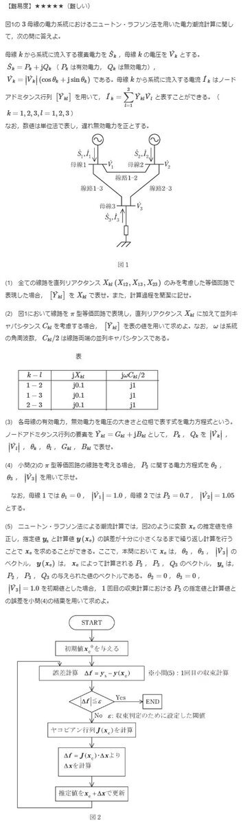【#電験一種 過去問チャレンジ】 R3電力管理問3。AC法潮流計算に関する問題。 原理は何となく理解できているから30分で完答できるかなと久しぶりにチャレンジしたけど、間に合わない… 当日は直流法でない限り、解きません! でも、接点方程式は要復習。 #二次まであと27日 denken-ou.com/c1/denryokukan… pic.x.com/sUwn5R1y1X