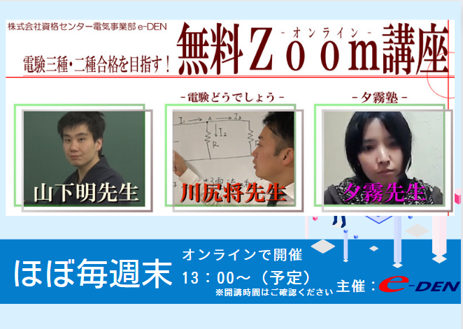 11/23(日)13:00からの無料電験オンライン講座は 13:00~ 夕霧塾「二種・一種の電気数学9」 15:00~ 山下明先生の「電験二種 一次理論対策9」 17:00~ 川尻将先生の「三種二種理論 回路計算1」 参加お申込・詳細は⇒ den-kan.com/e-den/yk_dk3ko… #電験二種 #一次 #電験三種 pic.x.com/1NutDVpY4f