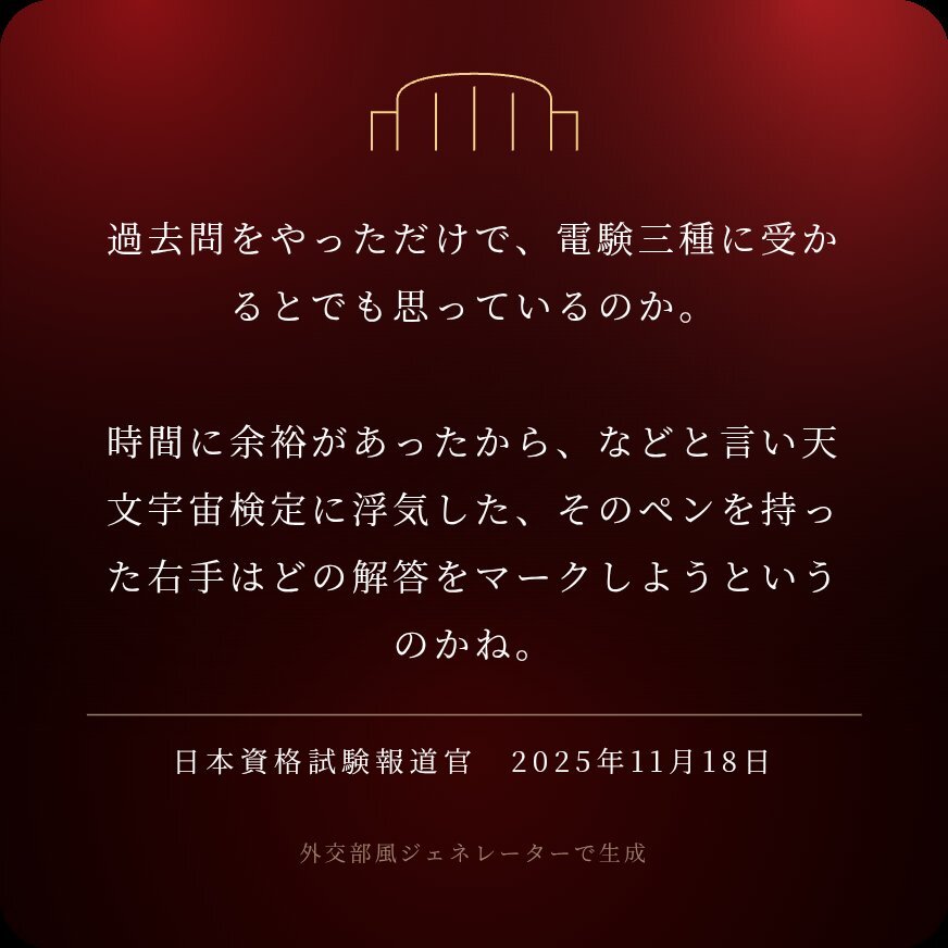 電験三種下期の試験申込みは11/27(木)迄です。 試験申込の詳細は⇒ shiken.or.jp/chief/third/ お申込み忘れのないように気を付けください。 ☆9/21に実施した電験三種合格ガイダンスの一部と資料を公開中! 詳細は➡ den-kan.com/e-den/2025/09/… #電験三種 #下期 pic.x.com/fdSodOexAV