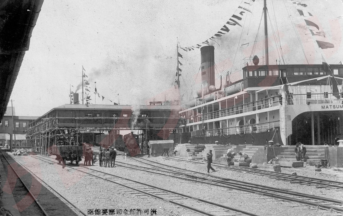 就航以前で桟橋工事も未完状態な函館連絡船桟橋と松前丸&翔鳳丸を写した弊社所有の写真絵葉書です。施設工事の内容や車両航送に併せた機関車による貨車の船内送り込み等を見ることが出来る貴重な1枚。惜しむらくは可動橋が見えない事だけでしょうか。#青函連絡船 #車両航送 #函館桟橋 pic.x.com/g96tq9O2W6
