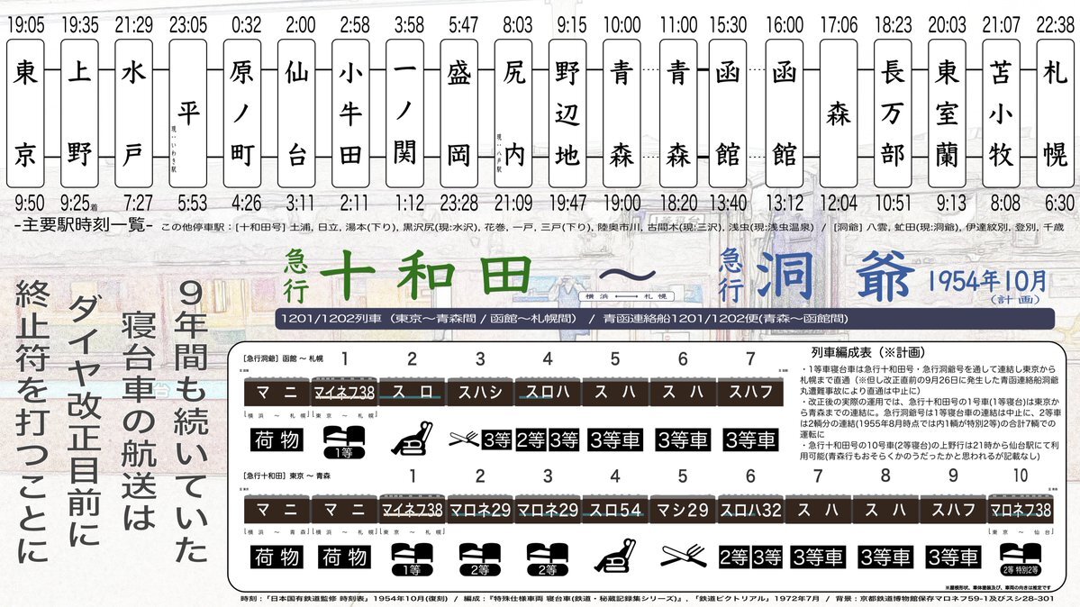 こんばんは、今夜の列車紹介は過去作から。急行十和田/洞爺です 今回は一風変わって計画のものです。寝台車を東京から札幌まで送る運用がこの頃まで残っていましたが、この時の改正直前にあった洞爺丸事故で車両航送は中止となってしまいました #日本を駆けた列車たち #十和田 #洞爺 #青函連絡船 pic.x.com/1PTCPA4YoO