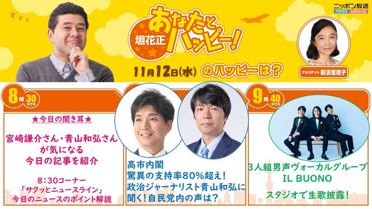 / 【#垣花正 あなたとハッピー!】 11/12(水) 朝8:00☀️ #宮崎謙介 さん& #青山和弘 さん生出演🎉 最新ニュースを深掘りW解説❗️ \ ゲストは3人組男声ヴォーカルグループ #ILBUONO さん🎤 happy@1242.com まで📩 #垣花正ハッピー pic.x.com/13RBfX94mz