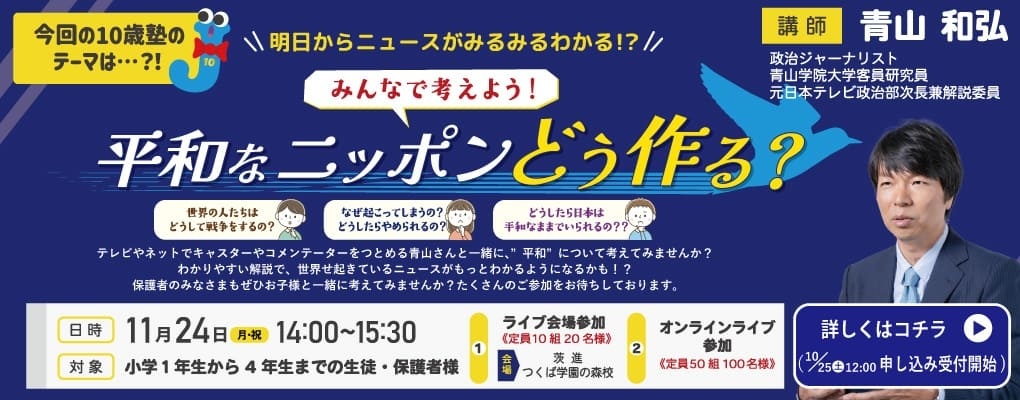 世界で起きているニュースがもっと分かりやすくなるかも⁉️ 政治ジャーナリストの #青山和弘 さんと一緒に”平和”について考えてみよう‼️ 『平和なニッポンどう作る?』 📌小1~小4生徒・保護者様 📌11/24(月祝) 📌会場:茨進つくば学園の森校/10組 オンライン参加🆗 #10歳塾 ichishin.co.jp/kyoiku/shogaku… pic.x.com/op41rX8wnn
