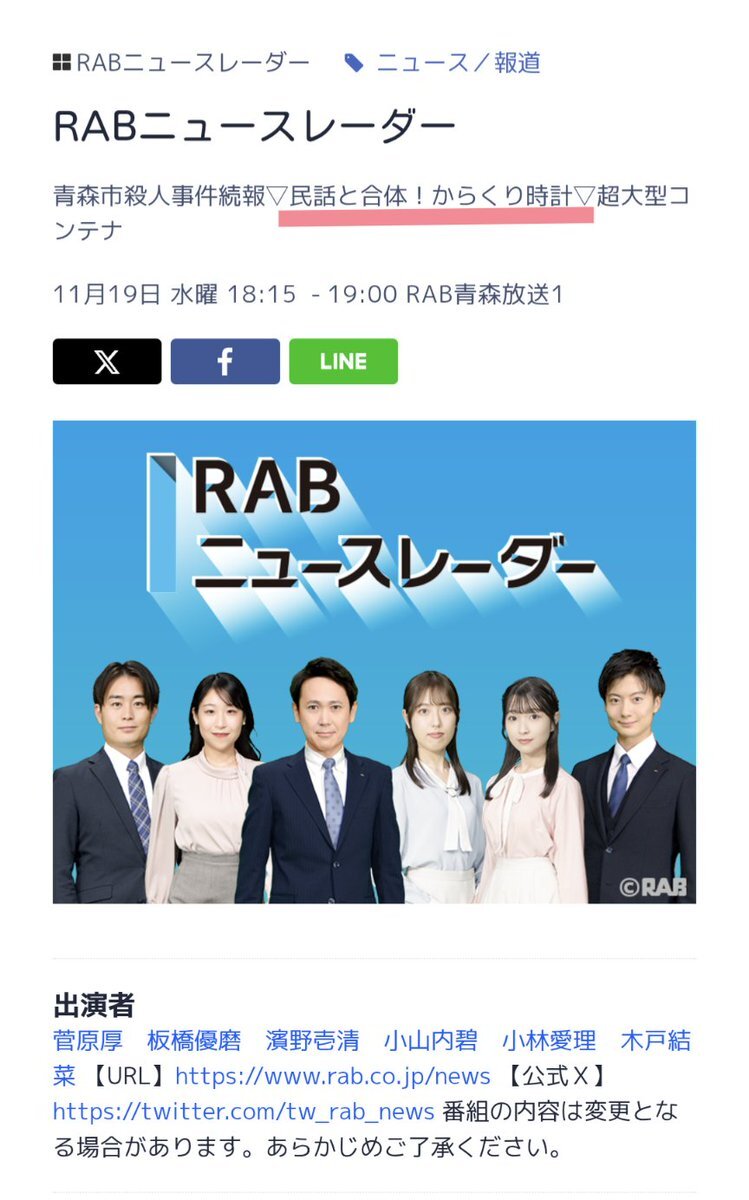【テレビ報道】 #南部昔コからくり時計 の内容について、11月19日(水曜日)18時15分から報道されます この企画を思いついたきっかけ、制作の様子、動きの説明など、報道される予定です お時間がある方はぜひご覧ください😃 #高橋みのる #はっち #南部昔コ #青森放送 #RAB pic.x.com/RjBEZe3d6n