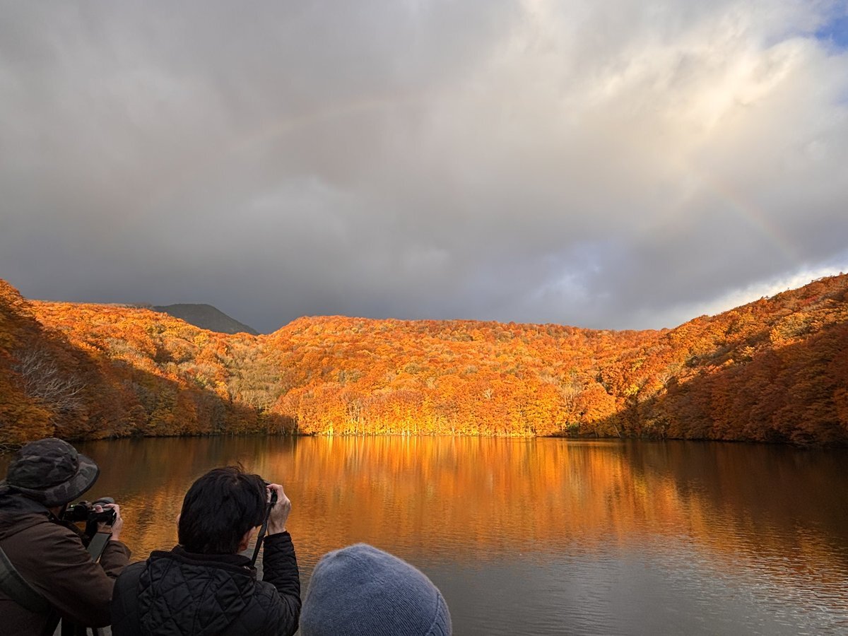 2025年11月2日 6時40分 蔦沼の様子 紅葉状況:見頃 デッキ混雑状況:約7割 朝日と虹がかかり、綺麗な蔦沼となりました。 #蔦沼 #十和田八幡平国立公園 #国立公園 #蔦温泉 #青森県十和田市 #カメラ pic.x.com/vJyIJTd3lt