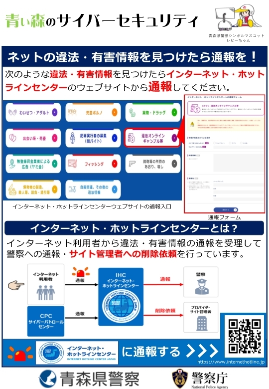 【インターネット・ホットラインセンター(IHC)に通報を!】 これって違法じゃない? 子供に悪影響だよ! そんな違法・有害情報は、インターネット・ホットラインセンターに通報しましょう! 【ここで一句・・・】 通報で、ホット[できるよ、インターネット [ ◎ _ ◎ ]V #青森県警察 #青森県 pic.x.com/ZrKsDzxB5I