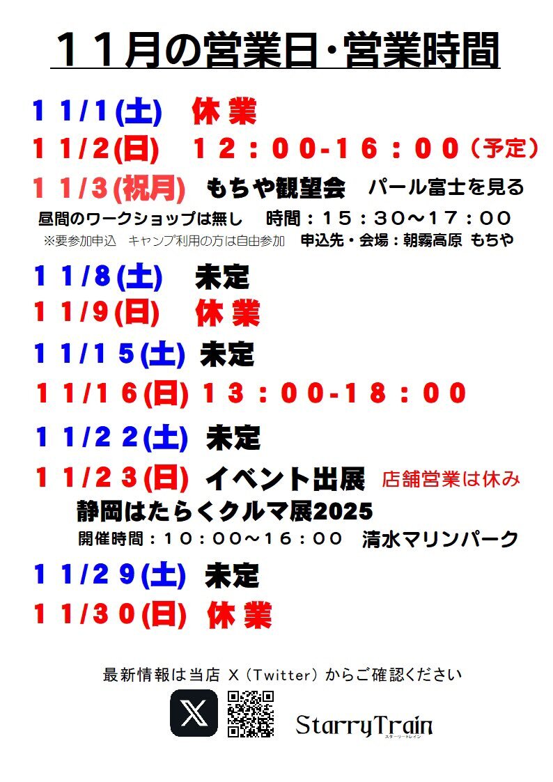 明日は4時起き🐈‍⬛🚛タイミーなので 寝ます。 おやすみなさい💤 #営業案内 11/8(土) 9(日)両日休業 11/15(土) 未定 11/16(日) 13:00-18:00🈺 11/22(土) 休業 11/23(日) イベント出展  10:00-16:00  #静岡はたらくクルマ展  会場 清水マリンパーク 11/29(土) 未定 11/30(日) 休業 #ワークショップ pic.x.com/U2MFfXBQi5
