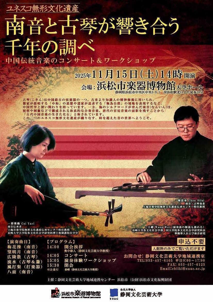 南音と古琴が響き合う千年の調べ🎼 中国伝統音楽のコンサート&ワークショップ 中国古典音楽の魅力に迫ります✨ 日時:11月15日(土)14:00―15:30 会場:#浜松市楽器博物館 入場無料(別途入館料が必要)、事前申込不要 詳細▶️suac.ac.jp/event/03818/ #静岡文化芸術大学 #SUAC #イベント pic.x.com/fCtQpsTUJl
