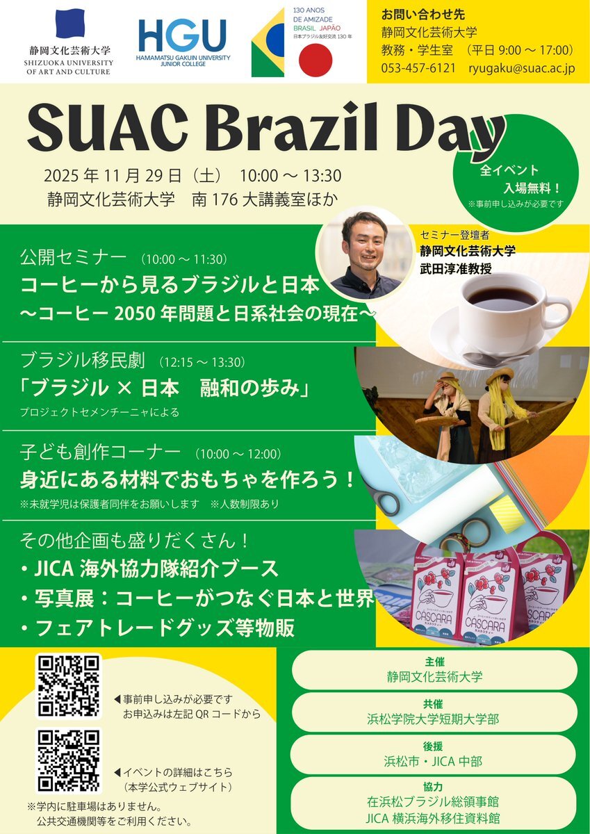 / 📣イベント「SUAC Brazil Day」開催! \ 前期開催の「SUAC Brazil Week」に引き続き、ブラジルを五感で楽しむイベントを本学にて開催します🥳 日時:11月29日(土)10:00―13:30 場所:#静岡文化芸術大学 📝入場無料、要事前申込 詳細・申込▶️suac.ac.jp/event/03841/ #SUAC #ブラジル pic.x.com/zScdtagweX