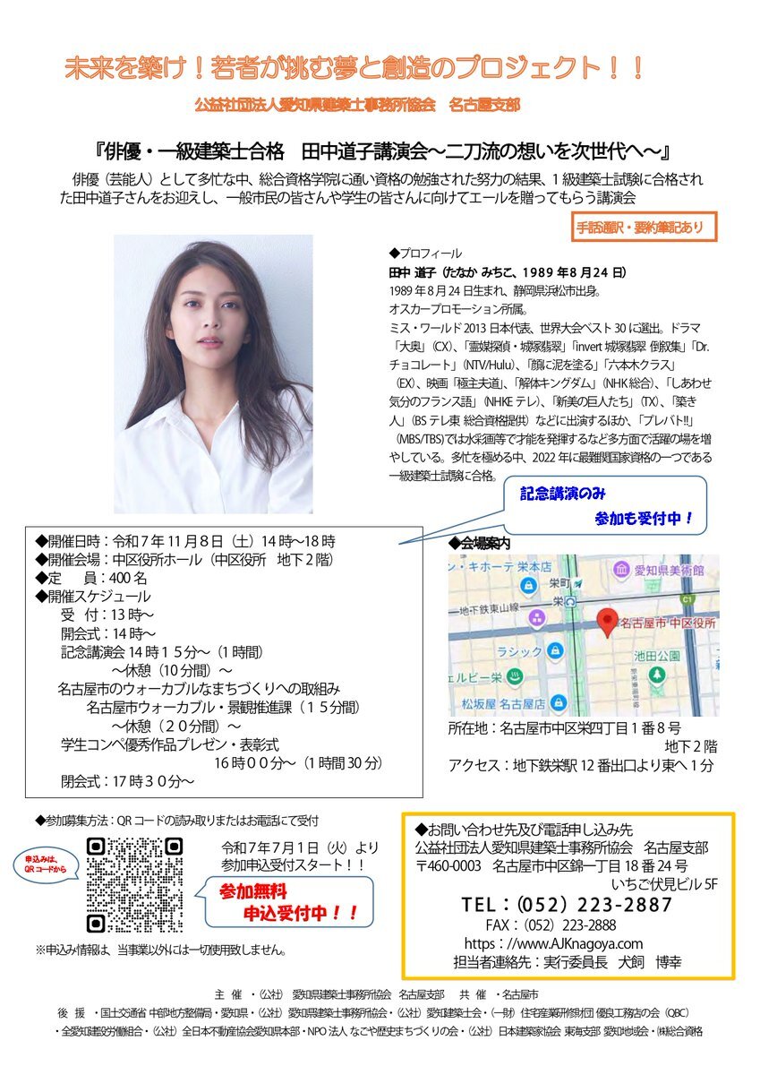 📢本学卒業生 #田中道子 さん講演会📢 「俳優・一級建築士合格 田中道子講演会~二刀流の想いを次世代へ~」 11/8(土)名古屋にて開催✨ どなたでもご参加いただけます(要申込)🥰 詳細▶️ajknagoya.com/anniversary/ #静岡文化芸術大学 #一級建築士 pic.x.com/xtjEHPaFX6