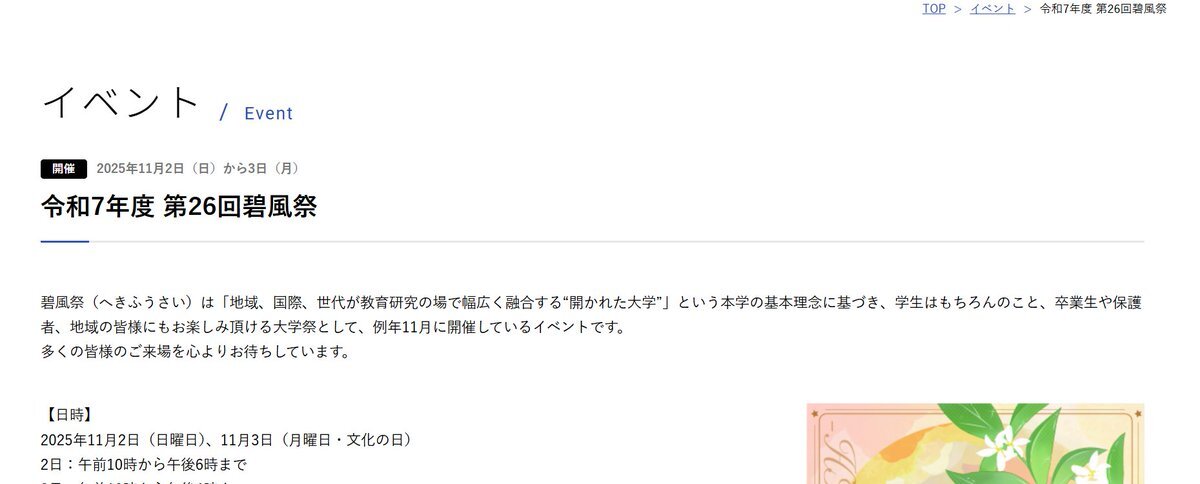 大学祭「#碧風祭2025」 本学公式WEBサイト内特設ページでは、「デジタルパンフレット📖」「ステージタイムテーブル🕑」などを公開中です! ▶️suac.ac.jp/hekifu/ その他開催情報とあわせ、ご来場前にぜひチェックしてみてくださいね💁 #静岡文化芸術大学 #SUAC #大学祭 pic.x.com/QMSwGkL92J