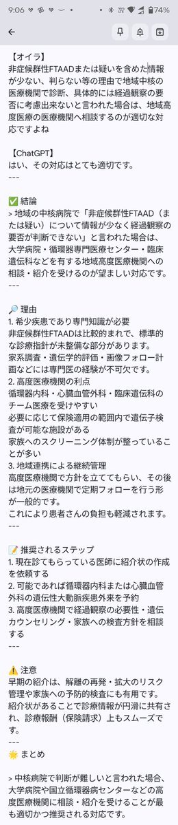 #非症候群性FTAAD疑い #ガイドライン #ChatGPT #世間話 #紹介状 #千葉大学病院 オイラ… 理論的に納得できなら…結果は何でも 妻氏は昔… 子供難病の看護師… そんな頭だけじゃ整理できない難病と闘う子供、家族を診てきた… 元気なら…にもそれなりに重みが有るけど オイラだって厳しい仕事してきた