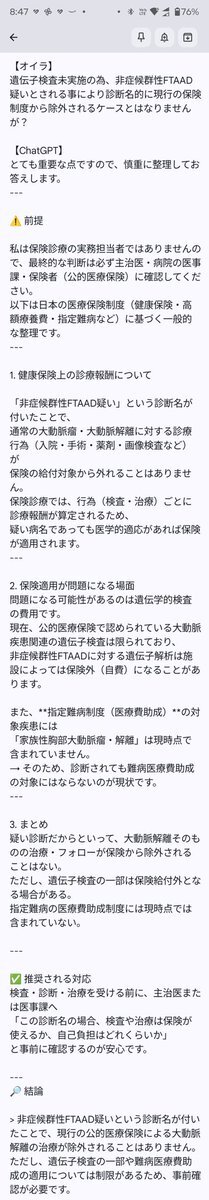 #保険適用 #レセプト病名 #非症候群性FTAAD疑い #ChatGPT #世間話 例によってChatGPTと世間話… 非症候群性FTAAD疑いの保険適用について… 担当医がレセプト病名として大動脈解離と明記するか? そこが重要らしい…ぼそっ pic.x.com/5SaezynFks