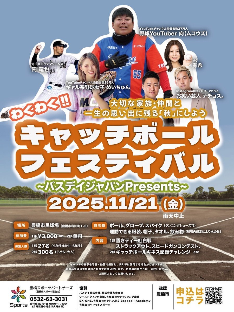 今年も豊橋にお邪魔します⚾️ キャッチボールフェスティバル、一緒に楽しみましょう〜! 今年は11/21(金)、県民ホリデーに開催です♪ #音大卒のウグイス嬢 #豊橋市 #イベント pic.x.com/DSfc2iIxLj