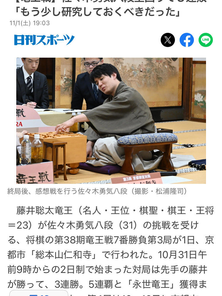 #三郷市 出身 #佐々木勇気八段 が藤井竜王に挑む竜王戦。第三局は残念ながら3敗目を喫しました。気持ちを切り替えて次戦京都競馬場での第四局へ向かって欲しいです。 #頑張れ佐々木勇気 今日は鈴木よしひろ代議士の秘書として埼玉14区を西へ東へ走ります! #国民民主党 #柴田ごいち pic.x.com/9f4FEhqxof