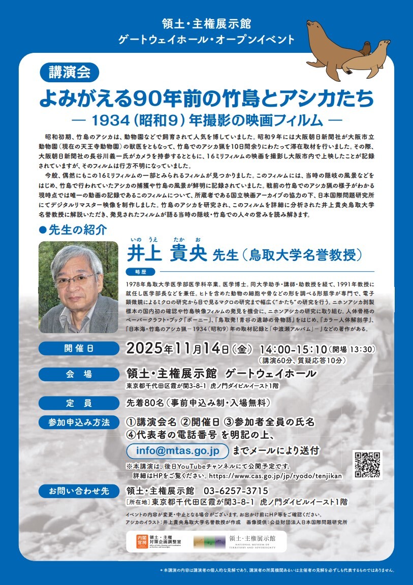 講演「よみがえる90年前の竹島とアシカたち —1934(昭和9)年撮影の映画フィルム—」(講師:井上貴央先生(鳥取大学名誉教授)) 日時:2025年11月14日(金)14:00~15:10 会場:#領土・主権展示館#ゲートウェイホール (2/3)