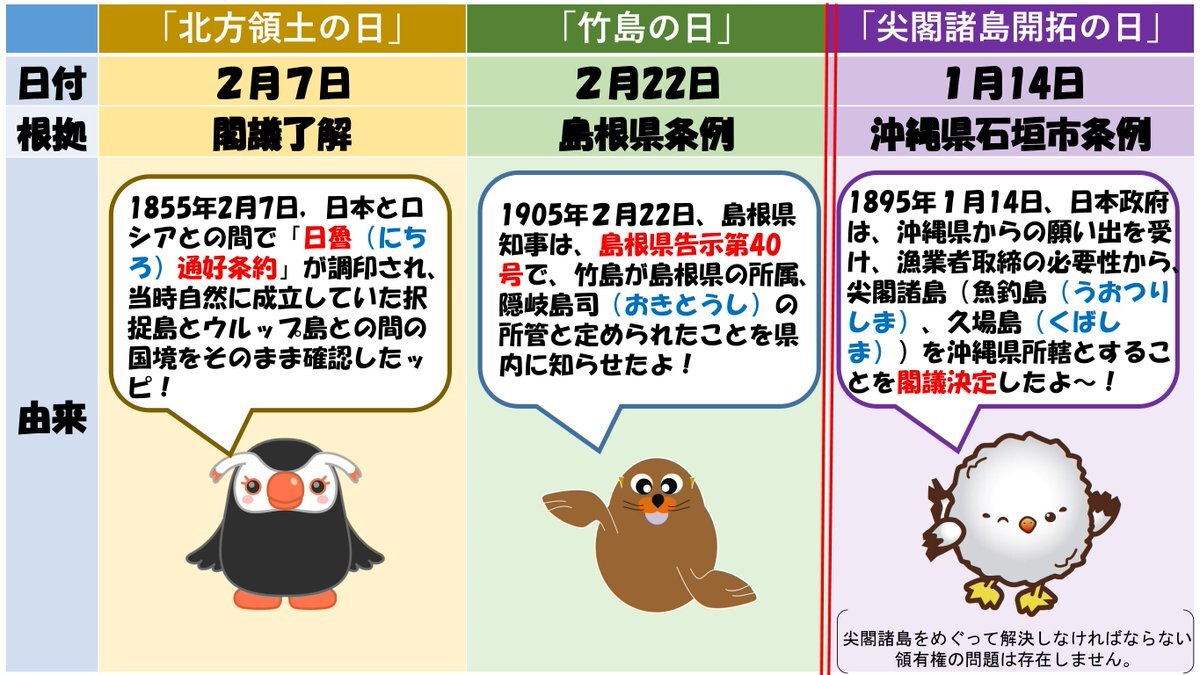 りゃんこだよ! 明日は「竹島の日」だけど、エリカちゃんとアルバちゃんと協力して、「北方領土の日」、「竹島の日」と「尖閣諸島開拓の日」の由来を整理してみたよ!みんな覚えてくれるとうれしいな!  #竹島の日 #領土・主権展示館 #北方領土の日 #尖閣諸島開拓の日 pic.x.com/bsEOmVKg8A