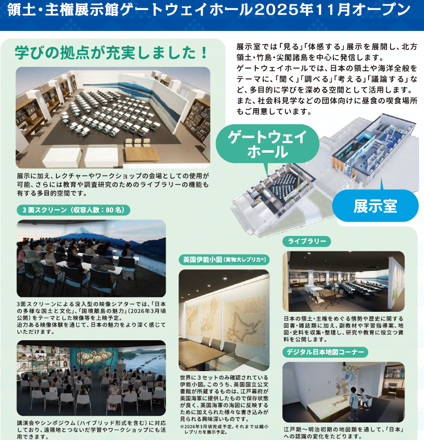 11月14日、#領土・主権展示館 は拡張し、#ゲートウェイホール がオープンします。同ホールは、4月にリニューアルした「体感」「体験」する展示による学びを「調べる」「考える」「議論する」ことを通じて深める多目的空間です。多くのイベントも企画しています。是非ご参加ください(要申込)。 pic.x.com/iEGmBwr5iY