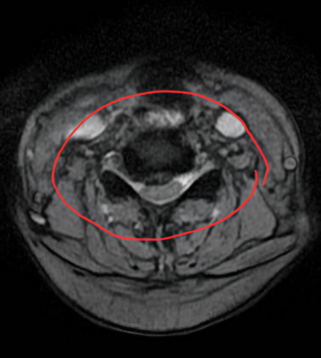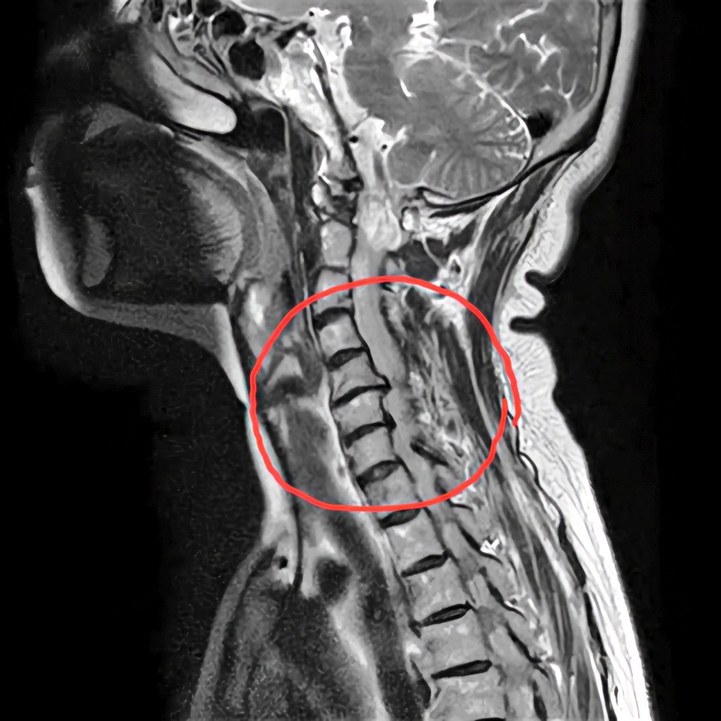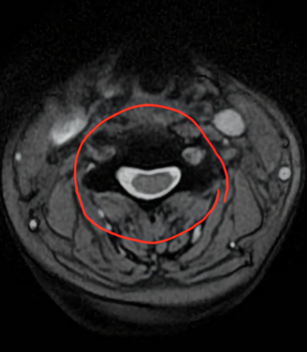 昨日診断された頸椎ヘルニアのMRI画像。縦に輪切りにされた5~6番目がずれてます。他2枚は横に輪切りにした画像。一枚は正常な頸椎で楕円になってますが、もう一枚はかなり潰された頸椎。ここが患部。なんか見てるだけで怖い。#頸椎ヘルニア #頚椎ヘルニア #椎間板ヘルニア pic.x.com/EpQGHwUqeI
