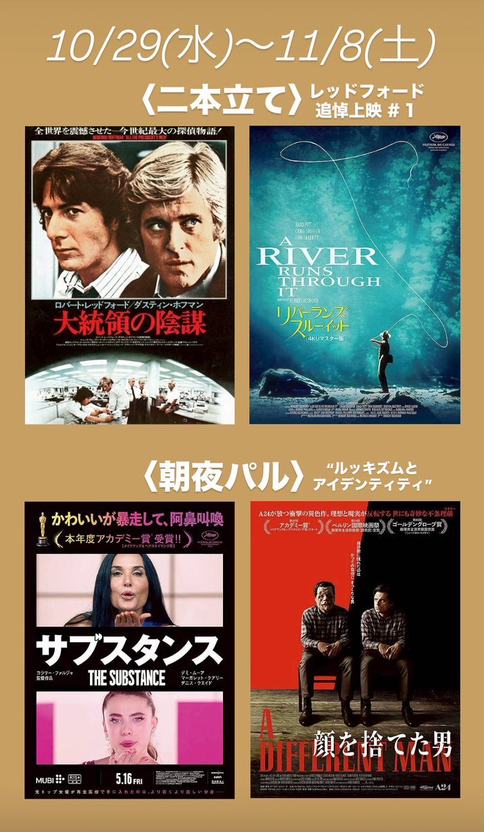 🖊️10/29(水)〜11/8(土)🎣 〈2本立て〉 レッドフォードよ永遠に- 『#大統領の陰謀』 ウォータゲート事件を追う記者の傑作社会派ドラマ 『#リバー・ランズ・スルー・イット』 壮大な自然を背景に描く家族の絆と葛藤 〈朝/夜パル〉 ルッキズムとアイデンティティ 『#サブスタンス』 『#顔を捨てた男』 pic.x.com/0lb9wQIc7H