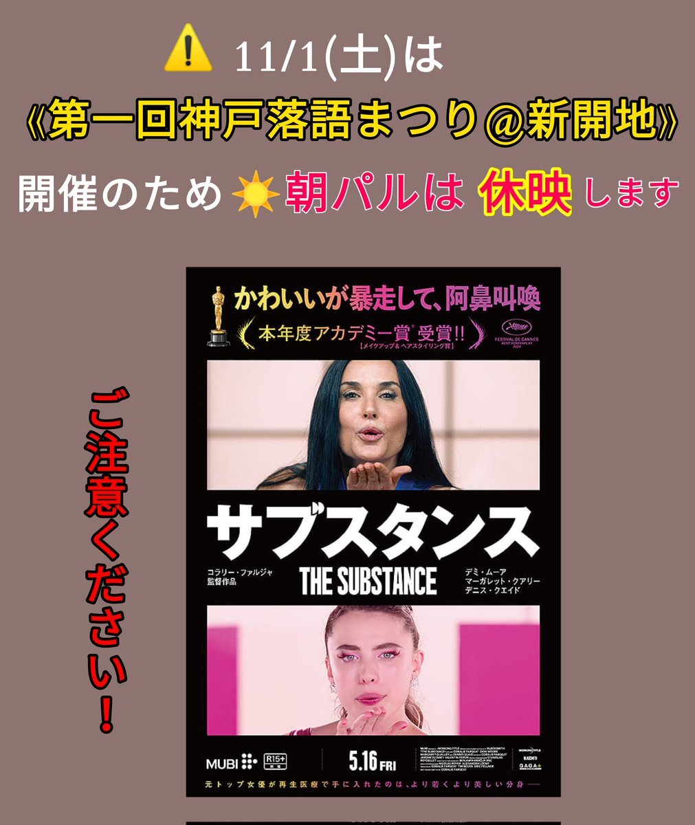 明日11/1(土)は『第一回 神戸落語まつり@新開地』開催のため朝パル『サブスタンス』は休映 🌟『神戸落語まつり』9:30開場 10:00開演 〈2本立て〉🉐映画サービスデー1000円学900円 12:15 17:15 『#大統領の陰謀』 14:55 『#リバー・ランズ・スルー・イット』 〈夜パル〉🉐 19:55『#顔を捨てた男』 pic.x.com/iaLfs6ODME