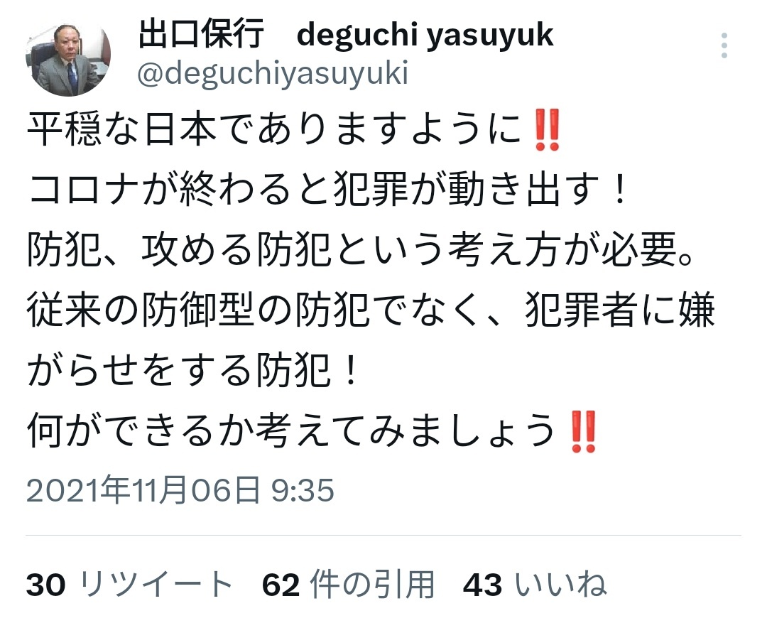 攻める防犯は犯罪者による悪用を想定されていなかったのでしょうか。 出口保行@deguchiyasuyukiさんは犯罪心理学者なのに犯罪者の行動を予測できませんでしたか。 攻める防犯によって 何が起きているか考えていますか。 #嫌がらせ犯罪 #集団ストーカー犯罪 #顔認証冤罪 x.com/deguchiyasuyuk… pic.x.com/iWaxdpeUcO x.com/love_peacecat/…