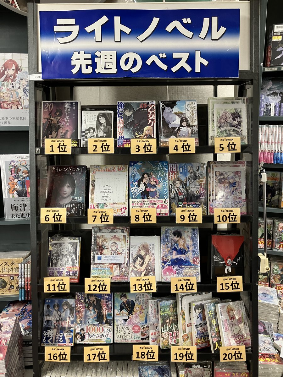 〔8F/ラノベ〕【先週の売上ベスト】は 1位『転生したら剣でした20』 2位『優等生がアダルトグッズを買いに来た1 上』 3位『あの乙女ゲーは俺たちに厳しい世界です5』 4位『よくわからないけれど異世界に転生していたようです6』 5位『君の声で色づく世界でキスをしよう』