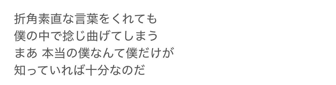 #類型別に毎日好きな歌教えて 「本当の君なんて僕には分からないから 最初から口に出さない方が結果的には辛くない そうして言うことすらもやめていったんだ」 「気が付いたら「何か違う、こんなことが言いたいわけじゃないんだ」って でももうどうでもいいや」 特にここの歌詞めっちゃ共感すぎる pic.x.com/mdyFDcmDji