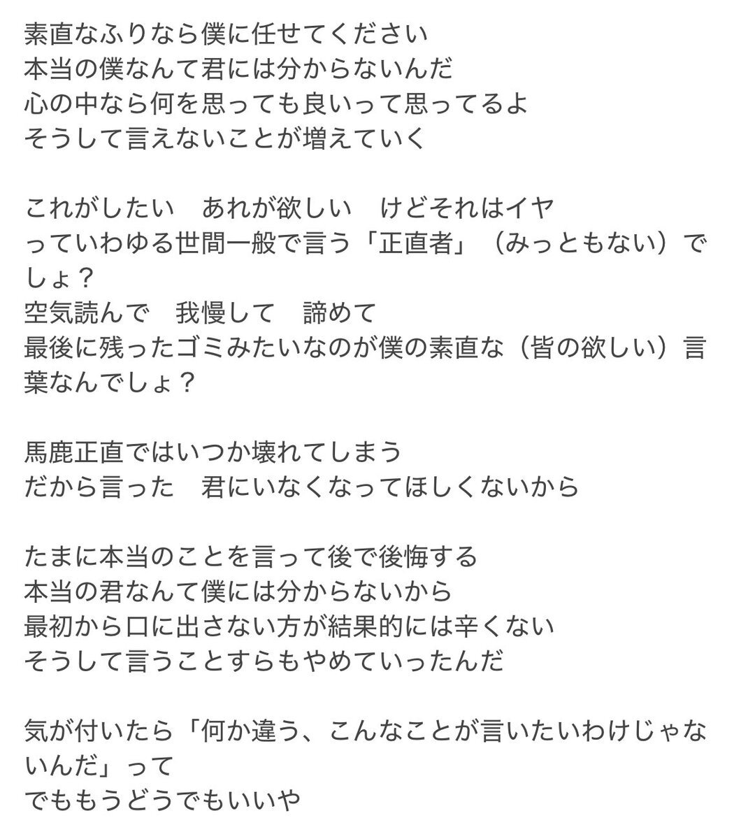 #類型別に毎日好きな歌教えて 「まあ本当の僕なんて僕だけが知っていたら十分なのだ」 ここの部分めっちゃわかる 本当の自分とか他人に分かる訳ないから、お互い詮索せずに、本音とか本性とか隠して相手の人生に深入りせず作り笑いしながらお互いそれぞれの人生を楽しもうぜっていう価値観です🖐️ pic.x.com/Kv9pLSNrCH