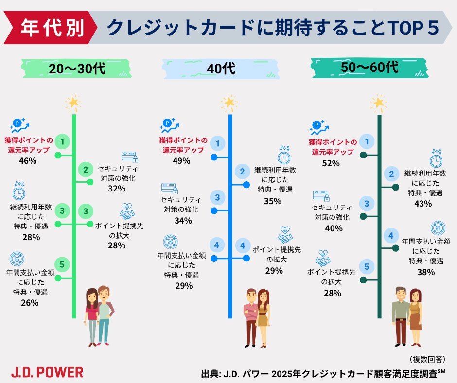 クレジットカード💳に期待すること:年代別TOP5✨全ての年代共通して「獲得ポイントの還元率アップ💰」がトップ japan.jdpower.com/ja/infographic… #JDPower #JDパワー #CS #顧客満足度 #クレジットカード #クレカ #ポイント還元 pic.x.com/OMj9XEjRWN