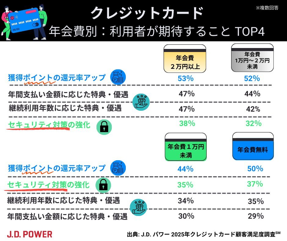 年会費別:クレジットカード💳利用者が最も期待することは、共通して「獲得ポイントの還元率アップ💰」japan.jdpower.com/ja/resources/i… #JDPower #JDパワー #CS #顧客満足度 #クレジットカード #クレカ #ポイント還元 pic.x.com/png3a4pb2E