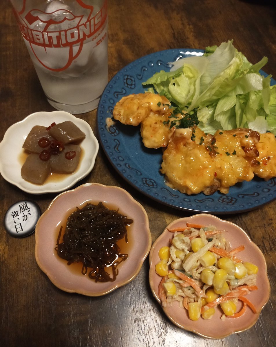 こんばんわ Taylorです ロックな夕食 #もずく酢 #ごぼうサラダ #こんにゃく #唐揚げマヨマスタード #焼酎 #ロックでキメる #ローリングストーンズ #風が強い日 #町田 #デニム #マルカワジーンズ三人衆 #D2M pic.x.com/MmQNMVa6Q6