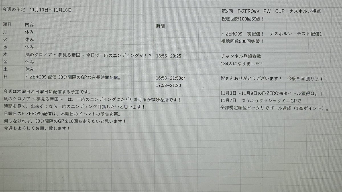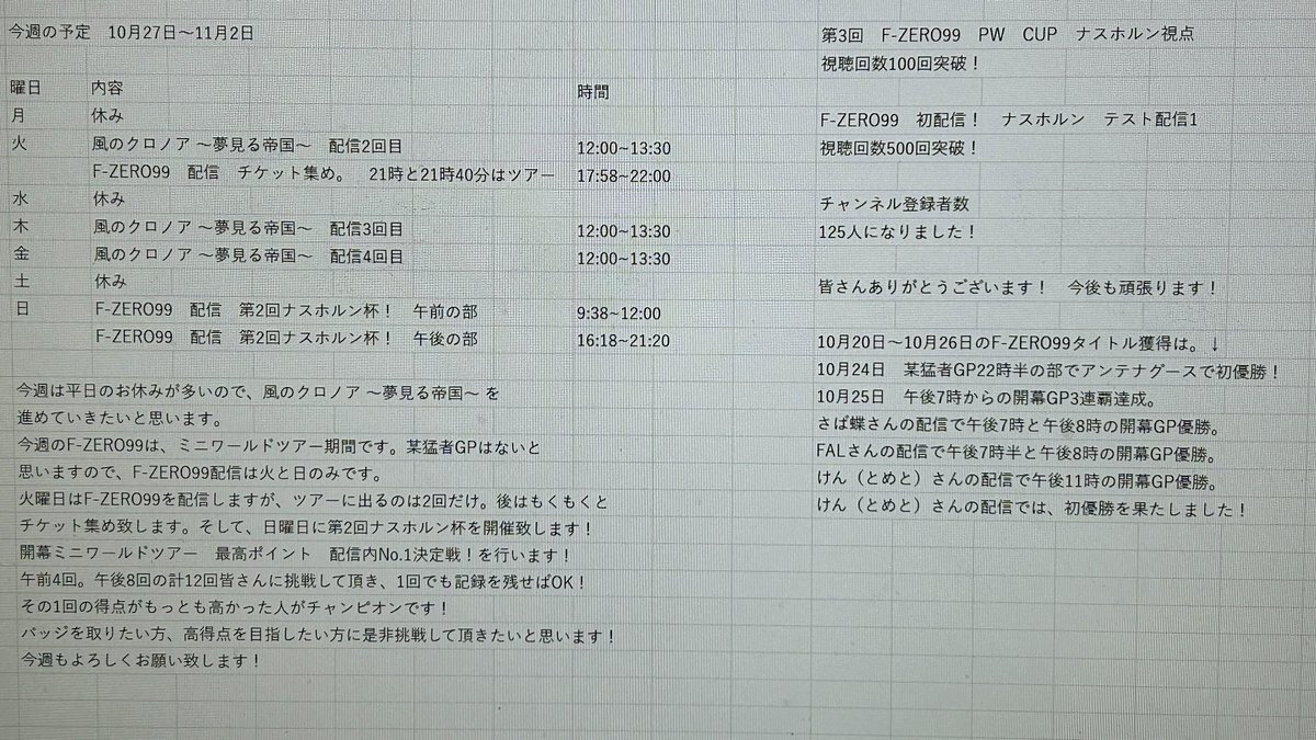 今週の予定表です。 今週は平日の休みが多く、風のクロノアを進めて行きたいと思います。 火曜日は、チケット集めがメインです。 11月2日にF-ZERO99ナスホルン杯ワールドツアー大会を開催致します! よろしくお願い致します! #FZERO99 #エフゼロ99 #風のクロノア pic.x.com/kjmwcQMjg5