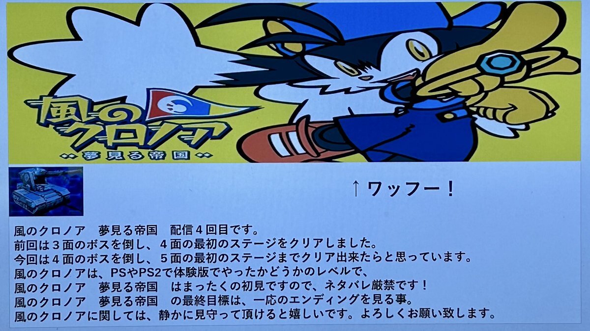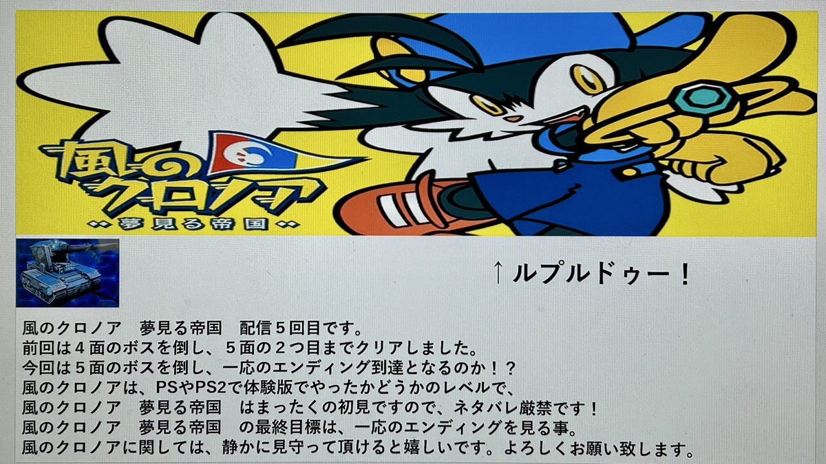 配信予告致します。 もうすぐ開始致します。 配信開始11月13日18:53〜20:25 風のクロノア配信です。 今日は5面のボスを倒し、一応のエンディングに辿り着けるか!? よろしくお願い致します。 配信URL ↓ youtube.com/live/aWP3g_yVP… #風のクロノア pic.x.com/T9xRIJDs8M