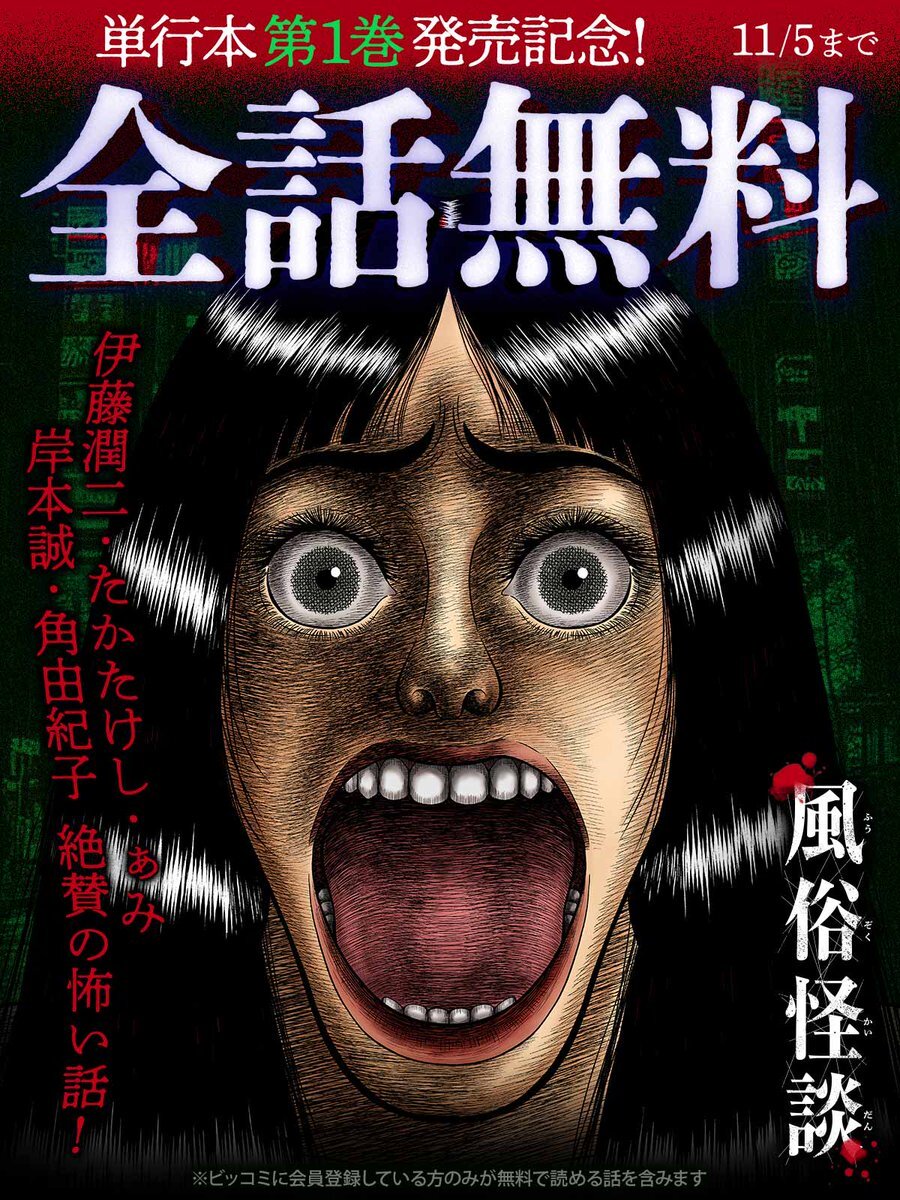 今だけ! 全話無料キャンペーン中! 伊藤潤二・たかたけし・ぁみ・ 岸本誠・角由紀子 絶賛の怖い話! 😱『#風俗怪談』 ▼今すぐ無料で読む bigcomics.jp/episodes/3e6e1… ✧単行本第1巻絶賛発売中! @fuzokukaidan #冨手優夢(@tomitomitomite) #三村真 #ビッコミ