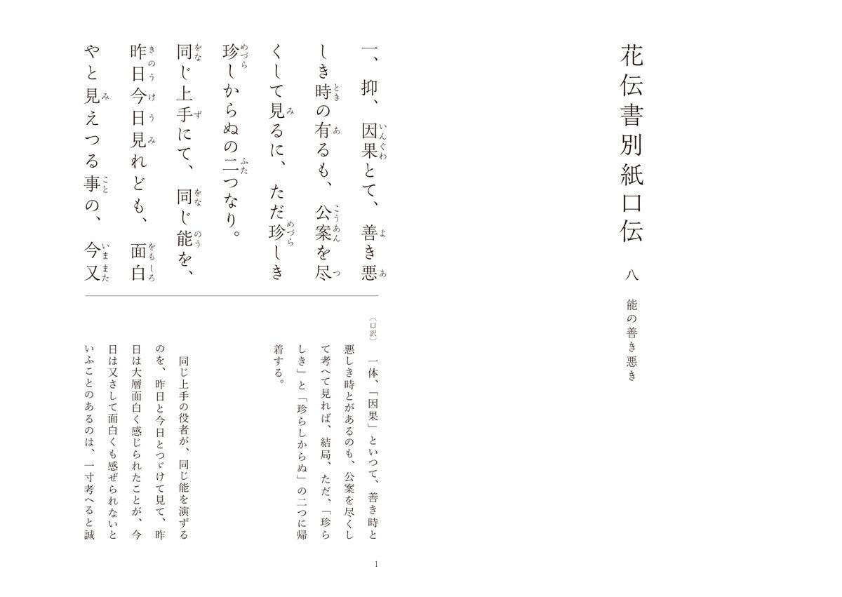 世阿弥 花伝書 48/49 #風姿花伝 花伝書別紙口伝 八【能の善き悪き】 「花」には決まった型があるわけではありません。 世阿弥は維摩経から「善悪不二、邪正一如」を引用して、花か否かは時と場合によりけりで、何が真の花と定められるものではないといいます。 全文はこちら muhenko.com/zeamijurokubus… pic.x.com/dBbbubnDFd