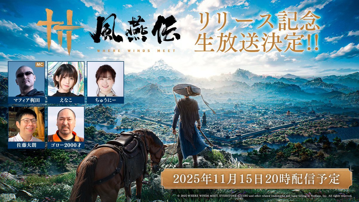 【生放送ゲスト紹介】 『風燕伝:Where Winds Meet』リリース記念生放送 ご出演いただく豪華ゲストをご紹介します! ▼出演者 MC:#マフィア梶田(@mafia_kajita)さん ゲスト:#えなこ(@enako_cos)さん ゲスト:#ちゅうにー(@sirokurochannel)さん ゲスト:#佐藤大朗(@Hiro_Satoh)さん