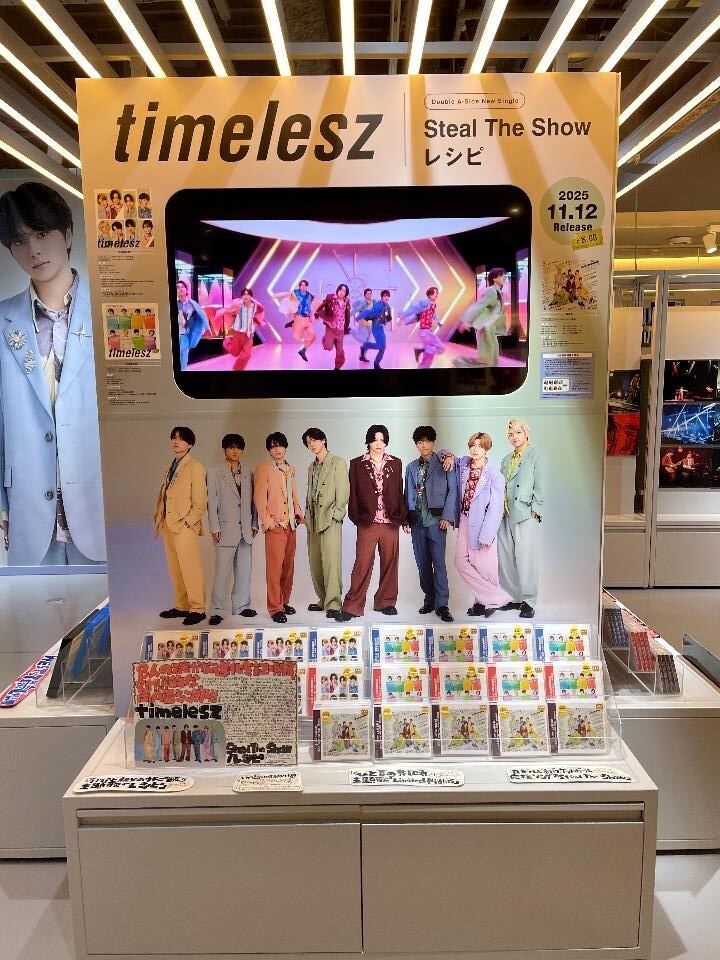 【#timelesz】 新体制となって初のシングル『Steal The Show / レシピ』が本日入荷🎉 日本テレビ系バスケットボール応援ソングの「Steal The Show」とドラマ「パパと親父のウチご飯」主題歌「レシピ」の両A面!! 吊りフラッグや特大ビジュアル、ビジョンなどなどシブツタ地下2Fをジャック中です💫