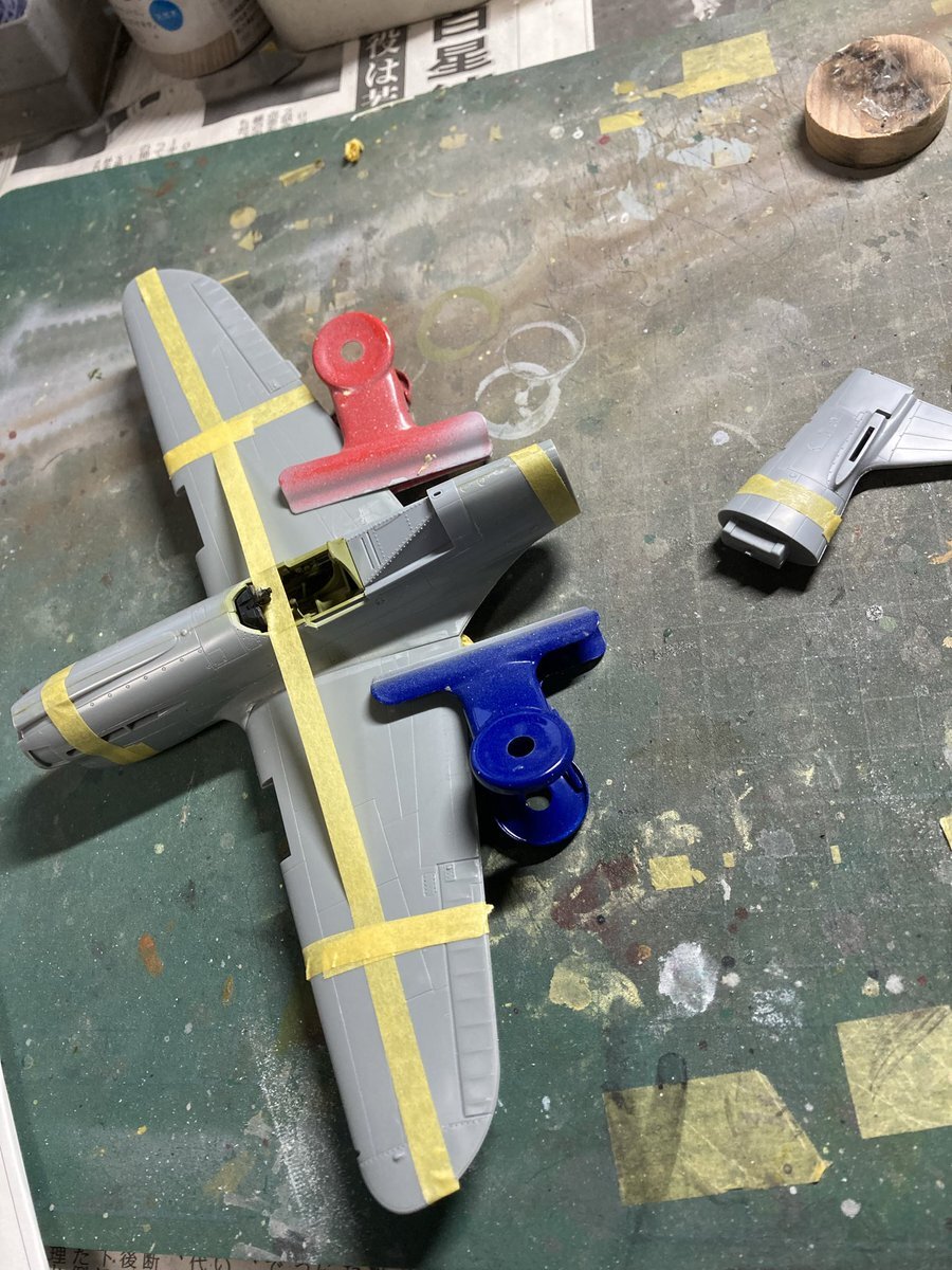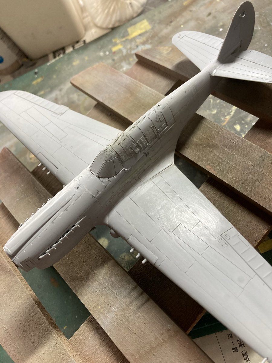 ハセガワのウォーホーク 一回目のサフ吹き 軽くペーパーで磨いて、処理の甘いところを見つけていきます 全然ダメですね #飛行機模型 #ハセガワ pic.x.com/IHx1qVRHiL