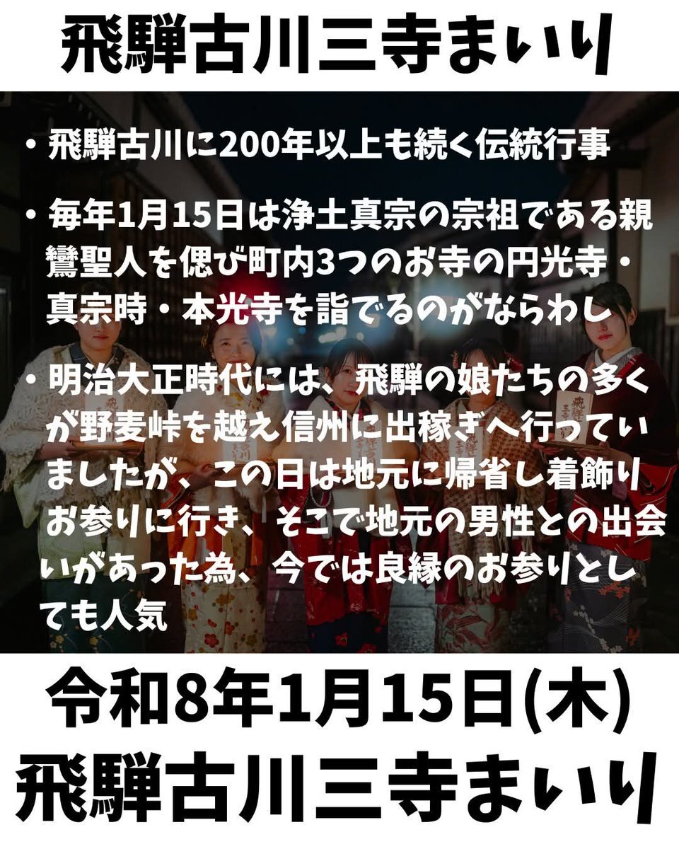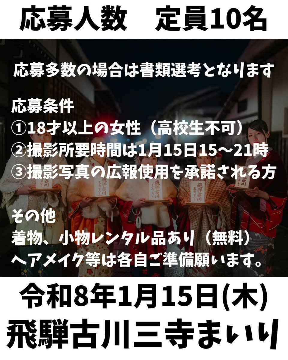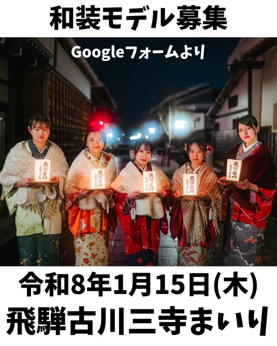 2026.1.15(木)飛騨古川三寺まいり🕯️ まつりに花を添える「和装モデル」を募集します 素敵な着物姿を 皆さんに披露しませんか☺️ 〇定員 10名 〇申込 Googleフォーム forms.gle/29gXJSAEqPpXmq… 〇締切 2025.12.12(金) #飛騨古川 #飛騨古川三寺まいり #三寺まいり #親鸞聖人を偲ぶ pic.x.com/EYnYlgc62J