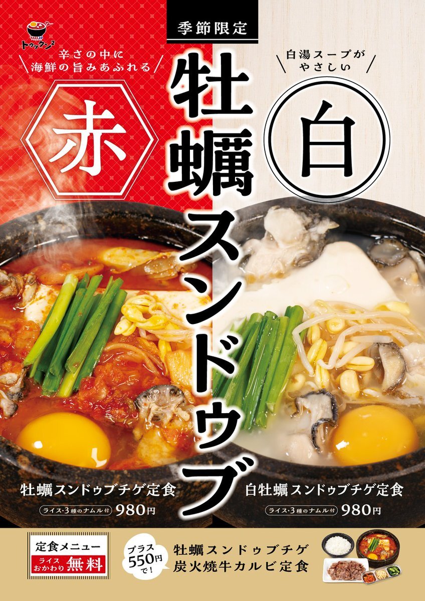 こんばんは🌛 トゥックン²です! いよいよ冬到来☃️❄ トゥックン²の 🦪牡蠣スンドゥブ🦪 であたたまりませんか?☺️ 海のミルクと呼ばれる牡蠣、じゅわっと濃厚な旨みが口いっぱいに広がります🤤 あったかスープに包まれた牡蠣を是非噛み締めてみてください❤ #スンドゥブ #松屋 #食べればわかるさ pic.x.com/6S1g6RL4E5
