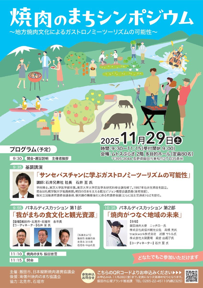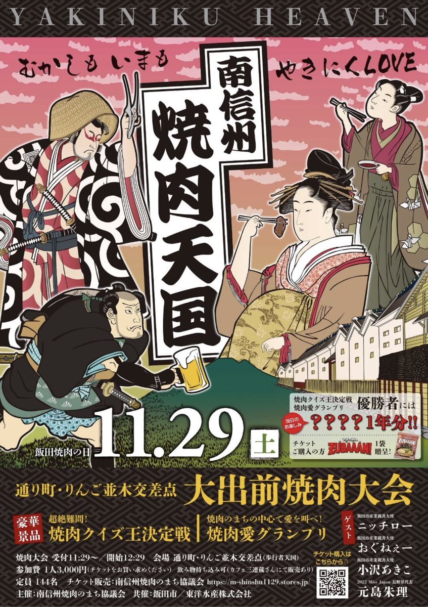 🔥11月29日は #飯田焼肉の日 🔥 日本縦断焼肉連携協議会を構成する北見市、飯田市、石垣市の各市長が飯田市ムトスぷらざに大集合。 講師には、石井兄弟社:石井至氏。飯田焼肉大使:ニッチローさんも参戦します。 11月29日だヨ!全員集合 お申し込みはこちらから。 apply.e-tumo.jp/city-iida-naga… pic.x.com/bKZ8HIp86a