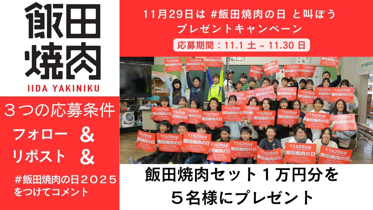 🔥第4回飯田焼肉月間開催中🔥 飯田焼肉セット🥩1万円分が抽選で当たる! 「11月29日は #飯田焼肉の日 と叫ぼう」キャンペーンを実施中。 【応募方法】 ①@IIDA2027 をフォロー ②この投稿をリポスト ③#飯田焼肉の日2025 をつけてこの投稿にコメント 期間は11月1日〜30日まで。 詳細はこちら↓