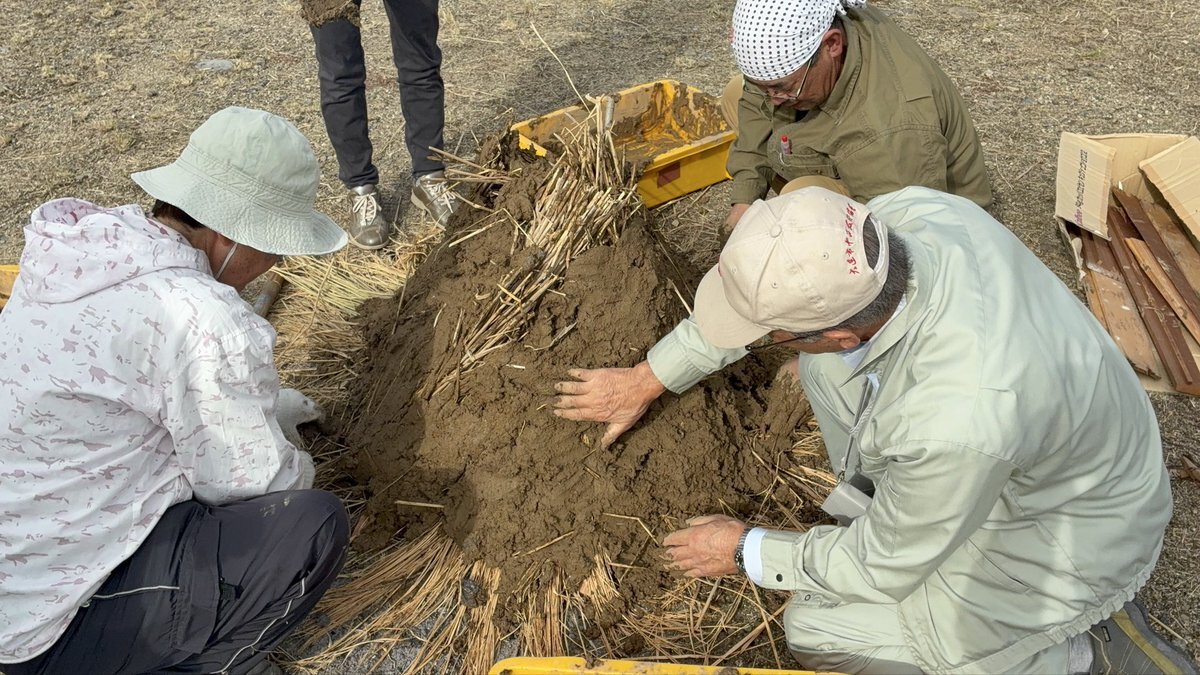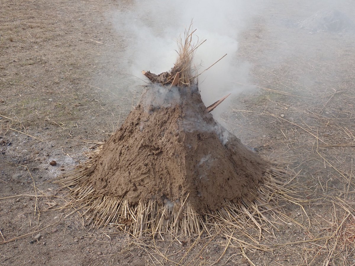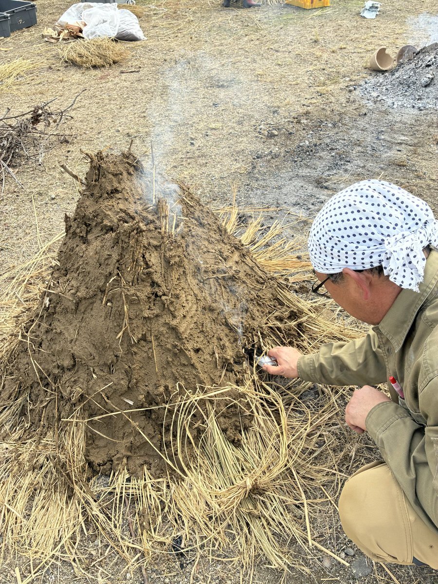 土器焼き準備ができたので、先程まで湿気を飛ばすために炙っていた土器を、民族事例を参考に、本格的に焼いていきます。 積み上げた土器に木や藁で囲いを作った後、粘土で周りを塞ぎ、中に火をつけます。 まるで火山のよう👀✨️ #香川県埋蔵文化財センター #讃岐まいぼら #土器焼き #坂出市 #府中町 pic.x.com/kUF0LoyBxB