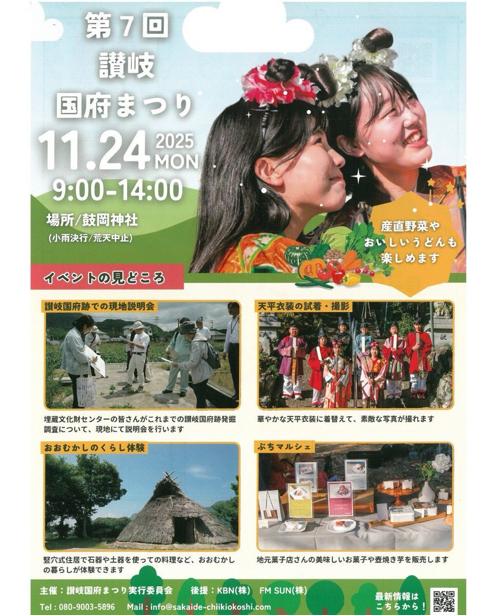 第7回讃岐国府まつり 開催!! 日時:11月24日(日) 9時~14時 場所:#鼓岡神社#イベント 本部)周辺 駐車場:#香川県埋蔵文化財センター、府中こども園 #讃岐国府跡 の解説、天平衣装の試着・撮影、おおむかしの暮らし体験、ぷち #マルシェ #イベント 盛りだくさん、お越しを待ちしてます! pic.x.com/dT12aEN2Kz