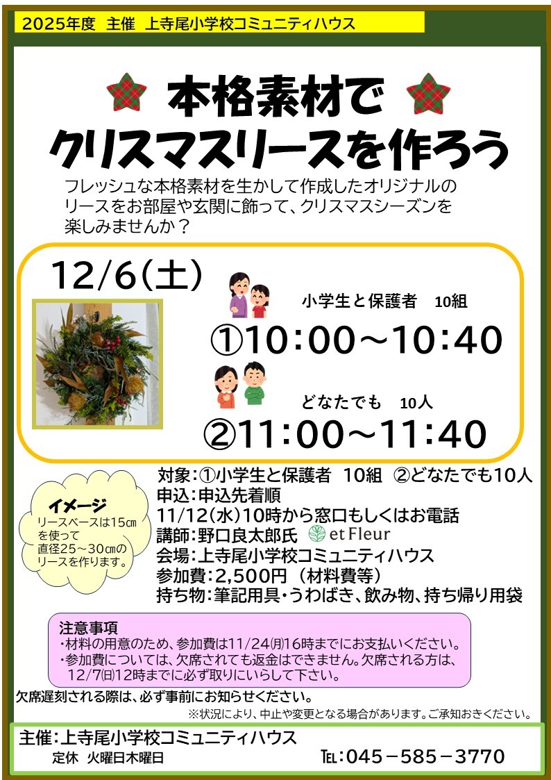 【本格素材でクリスマスリースを作ろう!】材料を準備する都合上、申込は明日12/1㈪12時までとなります。小学生親子も一般もまだ定員に余裕がありますので、ぜひご参加くださいね。お待ちしております。#クリスマスリース #鶴見区 #馬場 pic.x.com/GxBJyE3HUG