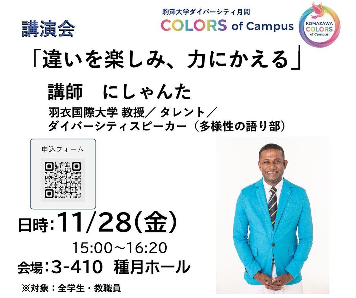 お知らせ🎙️11/28(金)15:00〜 駒澤大学「COLORS of Campus」ダイバーシティ月間で講演します。テーマは『違いを楽しみ、力にかえる』✨ 対象:全学生・教職員。3-410種月ホールでお待ちしています🖐️ 詳細👇nishan.jp/schedule03/div… #駒澤大学 #ダイバーシティ #ダイバーシティスピーカー #にしゃんた pic.x.com/pKodwLWLIU