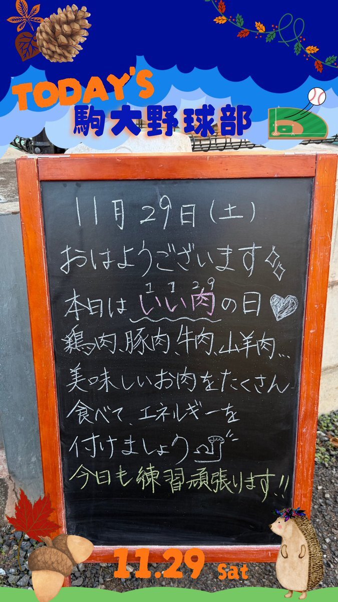 【今日の駒大野球部】 11月29日(土) 天気:☀️ 今日はいい肉の日🍖🐖🐄🐔🐐 美味しいお肉を食べて 今日も1日頑張ります! #駒澤大学硬式野球部 #駒澤大学 #駒大野球部 #東都大学野球 #今日の駒大野球部 pic.x.com/bkEGFAwFlO